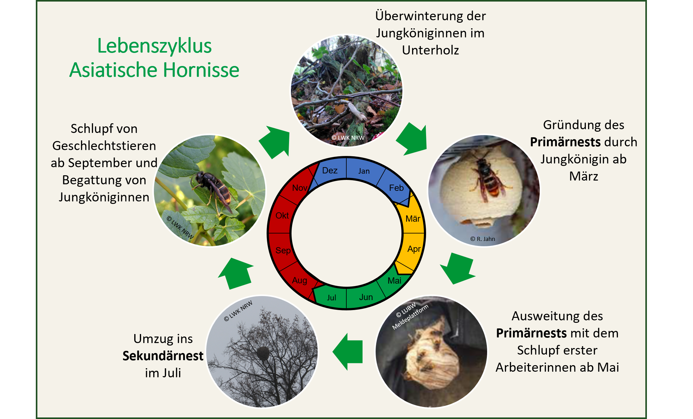 Wie bei anderen sozialen Faltenwespen überwintern bei der Asiatischen Hornisse nur die Königinnen. Sobald es im Februar oder März wärmer wird, kommen sie aus ihren Winterverstecken und gründen ein neues Nest. Das sogenannte Primärnest wird an einem geschützten Ort in Bodennähe gebaut. Dies kann unter Abdächern, in Schuppen, Garagen, Hecken, Höhlen sein. Die Königin baut einen Wabenteller mit hexagonalen Zellen und schützt ihn mit einer kugelförmigen Hülle. In jede Zelle legt sie ein Ei, aus dem in ca. 48 Tagen eine Arbeiterin schlüpft. Die Entwicklungszeit ist stark anhängig von der Temperatur und der Nahrungsversorgung und verringert sich später im Jahr auf ca. 30 Tage. Sobald die ersten Arbeiterinnen ab Mitte Mai schlüpfen, übernehmen sie die Aufgaben der Brutpflege, des Nestbaus und der Nahrungsbeschaffung. Die Königin legt dann nur noch Eier und verlässt das Nest nicht mehr.